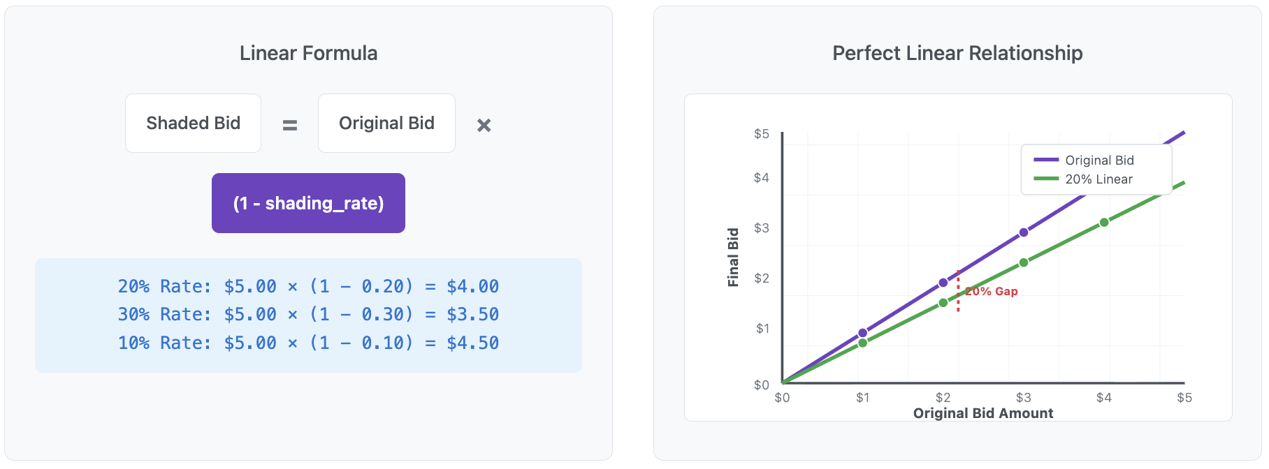 Linear shading creates a direct proportional relationship where every bid receives the same percentage reduction regardless of its absolute value. This mathematical property makes it the most predictable of all shading algorithms, as the reduction amount scales directly with bid size while maintaining constant relative impact across all auction opportunities.