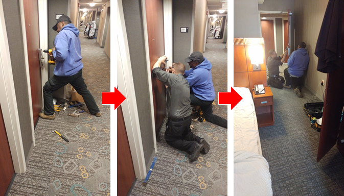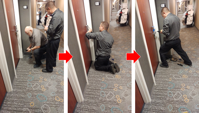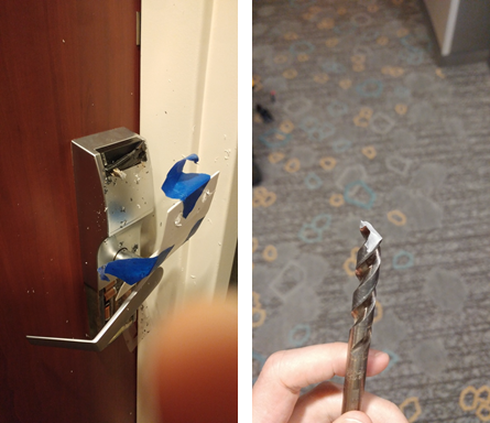 (Left to right) Master key didn’t work, so they busted out the key reader with a screwdriver, and then began drilling.