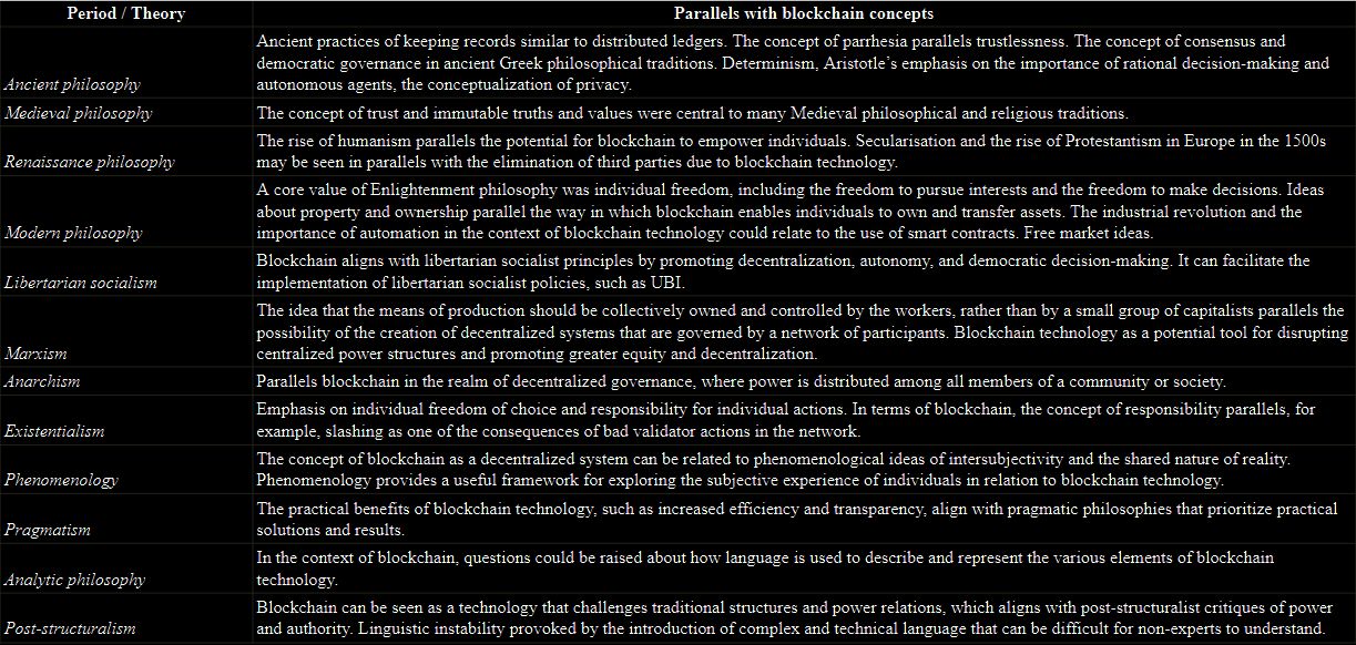 The potential connections between blockchain and modern philosophy, which span the period between the XVII and early XX centuries, may be thought-provoking. Thus, Modern philosophy emphasizes the importance of reason, empiricism, and skepticism. Additionally, modern thought challenges traditional notions of identity, truth, and hierarchy, which is similar to how blockchain challenges the concept of trust and creates a new kind of truth that is transparently based on verifiable records.