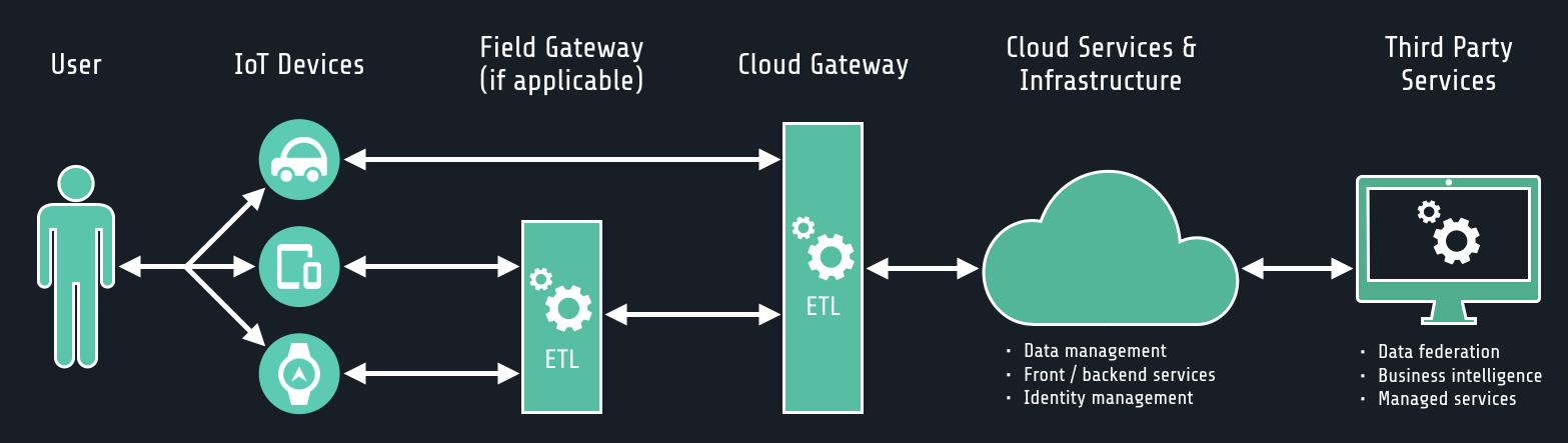 - IoT Cloud & Storage: Infrastructure-as-a-Service (IaaS) providing IoT-compatible tech stacks and backend services (e.g., ETL) which sync to connected devices and data; Example: AWS, Azure, Salesforce