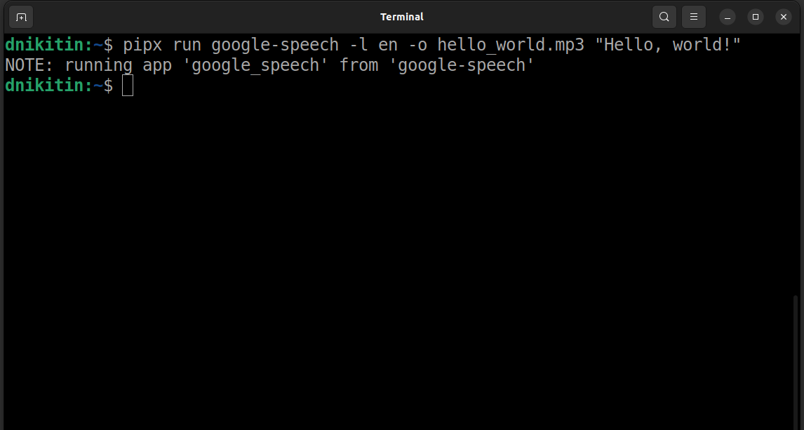 In the console, run the following command: $ pipx run google-speech -l en -o hello_world.mp3 "Hello, world!"
