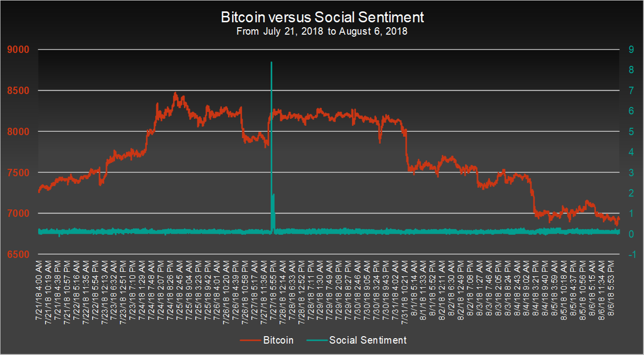 Since RoninAi is constantly analyzing social sentiment data, it recognized a massive change in social sentiment as this spike was hitting. The graph below shows Bitcoin’s price during the relevant period alongside RoninAi’s analysis of social sentiment data: