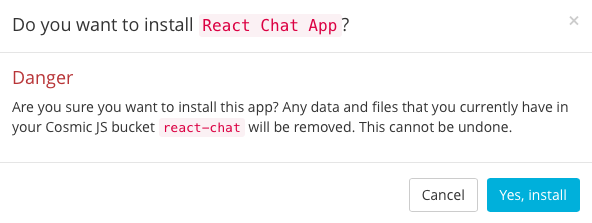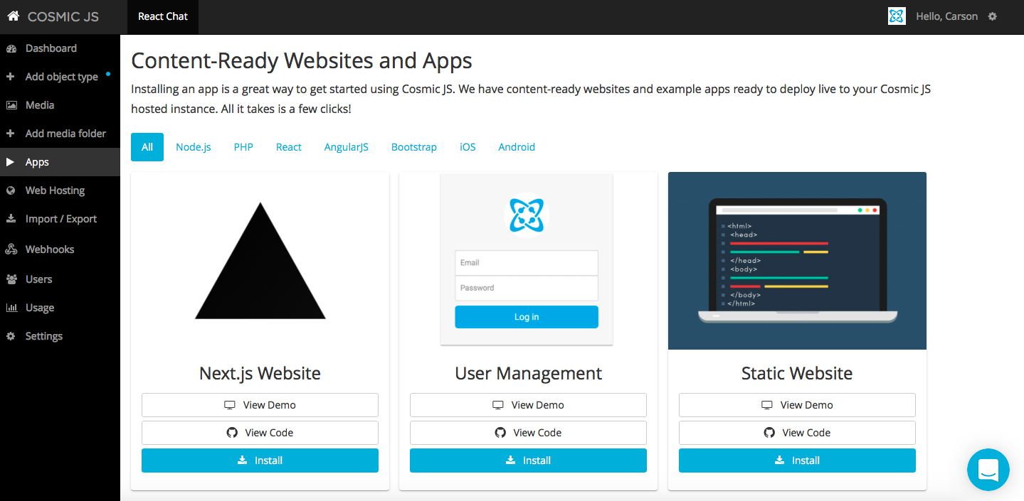 Simply click “Install” underneath the React Chat App icon to get started, or visit the Cosmic JS Apps Page.