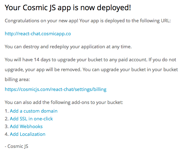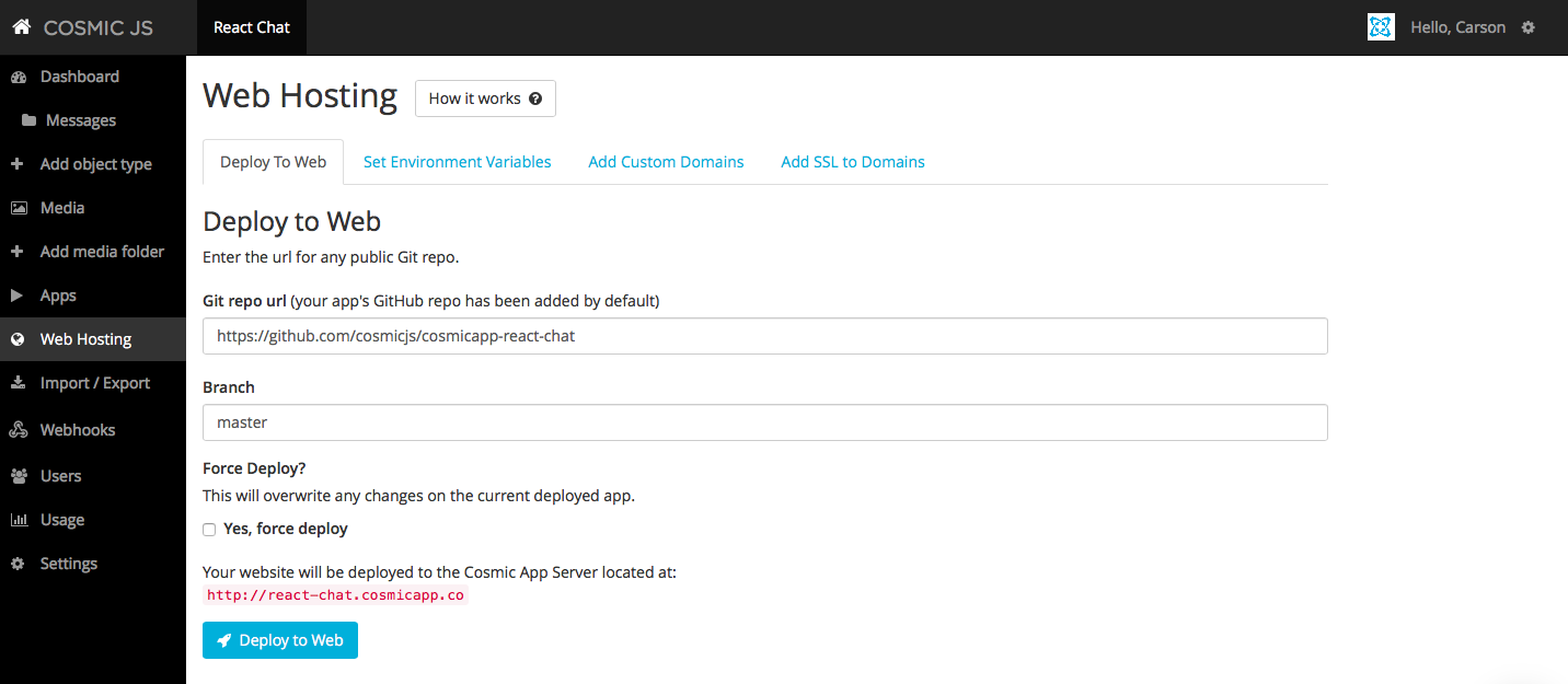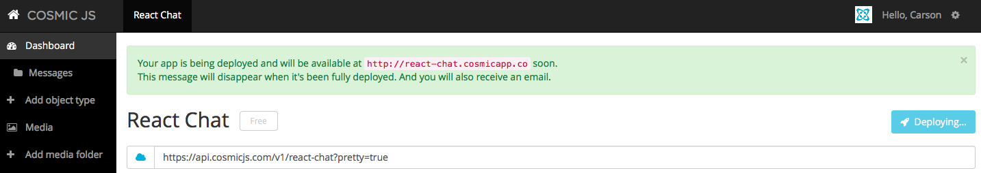 I clicked “Deploy to Web”. I can then edit Objects while my web application is deploying. You will receive an email confirming the deployment of your web application. If you encounter any issues during deployment, you may be routed to the Cosmic JS Troubleshooting Page.