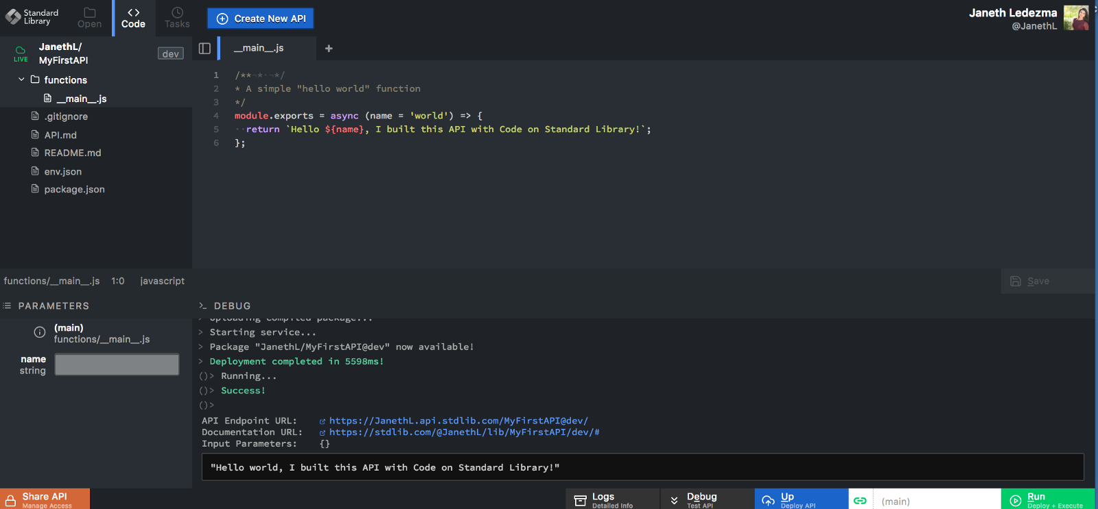 Clicking “Run,” turns your function into an infinitely scalable API endpoint in just a few seconds! Under the “Results” area you will notice a documentation portal - click it to see your API’s information on Standard Library. You will also see an API endpoint URL, click it and a new tab will open showing your“hello world” message live.