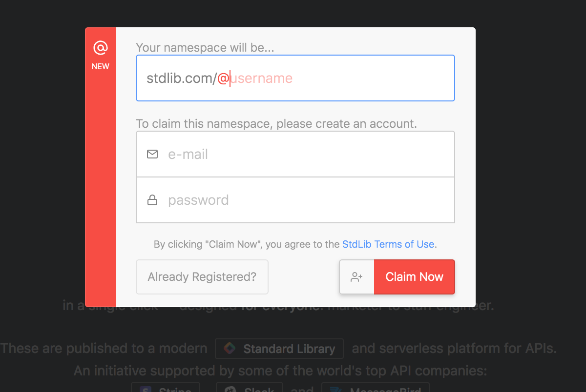 On the upper right corner of Code on Standard Library click (sign in). If you have a Standard Library account click Already Registered and sign in using your credentials. A module will pop up prompting you to claim a namespace (this is your username). Input your e-mail and choose a password.