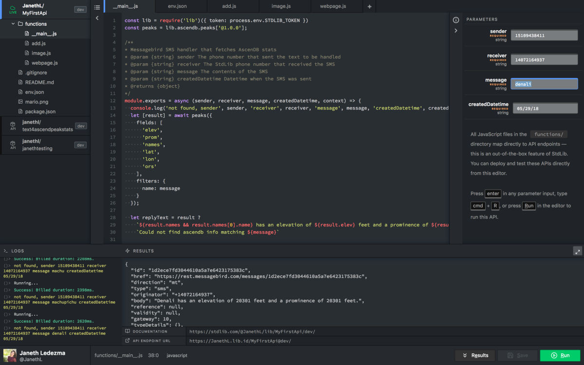 In this tutorial, you’ll learn how to build an API directly from your web browser — no other tools required — using Code on Standard Library, the online API editor. Whether you’re new to software development or a veteran looking for faster ways to ship code, I’ll demonstrate how quickly you can build a working API with Code on Standard Library. We’ll use Code on Standard Library to build a fully functional SMS service that connects AscenDB’s Peaks API for identifying mountain information and MessageBird’s API for sending SMS messages.