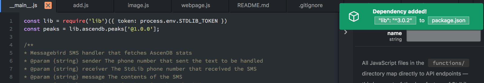 Once you paste the code into your __main__.js file, you will notice that your dependency on lib (the require('lib') line) is automatically added, there is no need to run an npm install through your terminal — Code on Standard Library will automatically modify your package.json file and install any npm packages into your service directory.