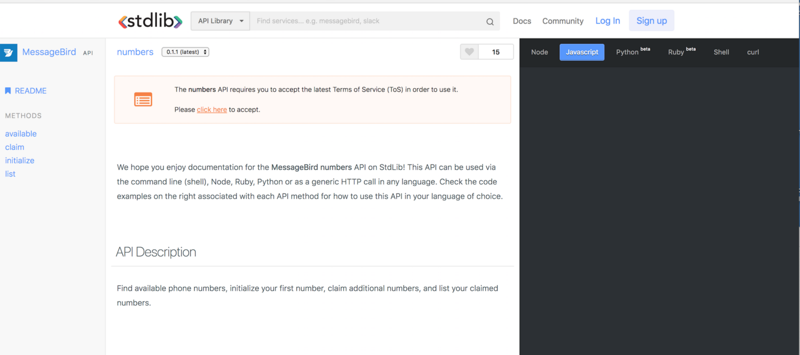 Keep Code on Standard Library open. In a different tab, navigate to the MessageBird Numbers API on Standard Library and accept the terms of service (the orange bar at the top).