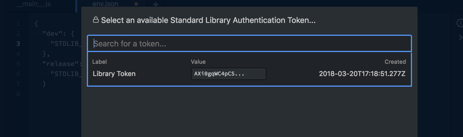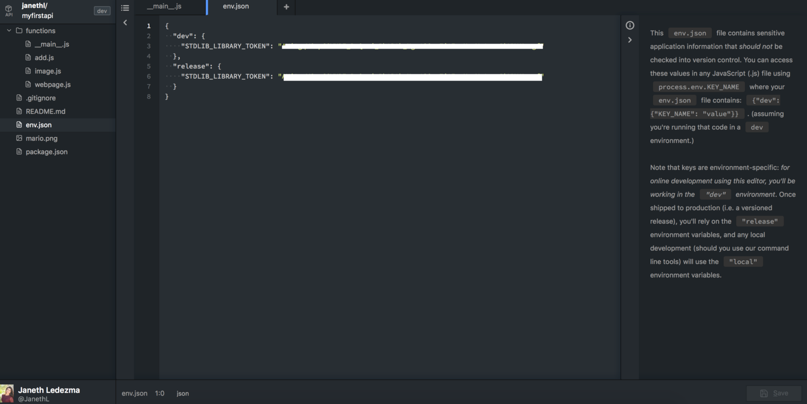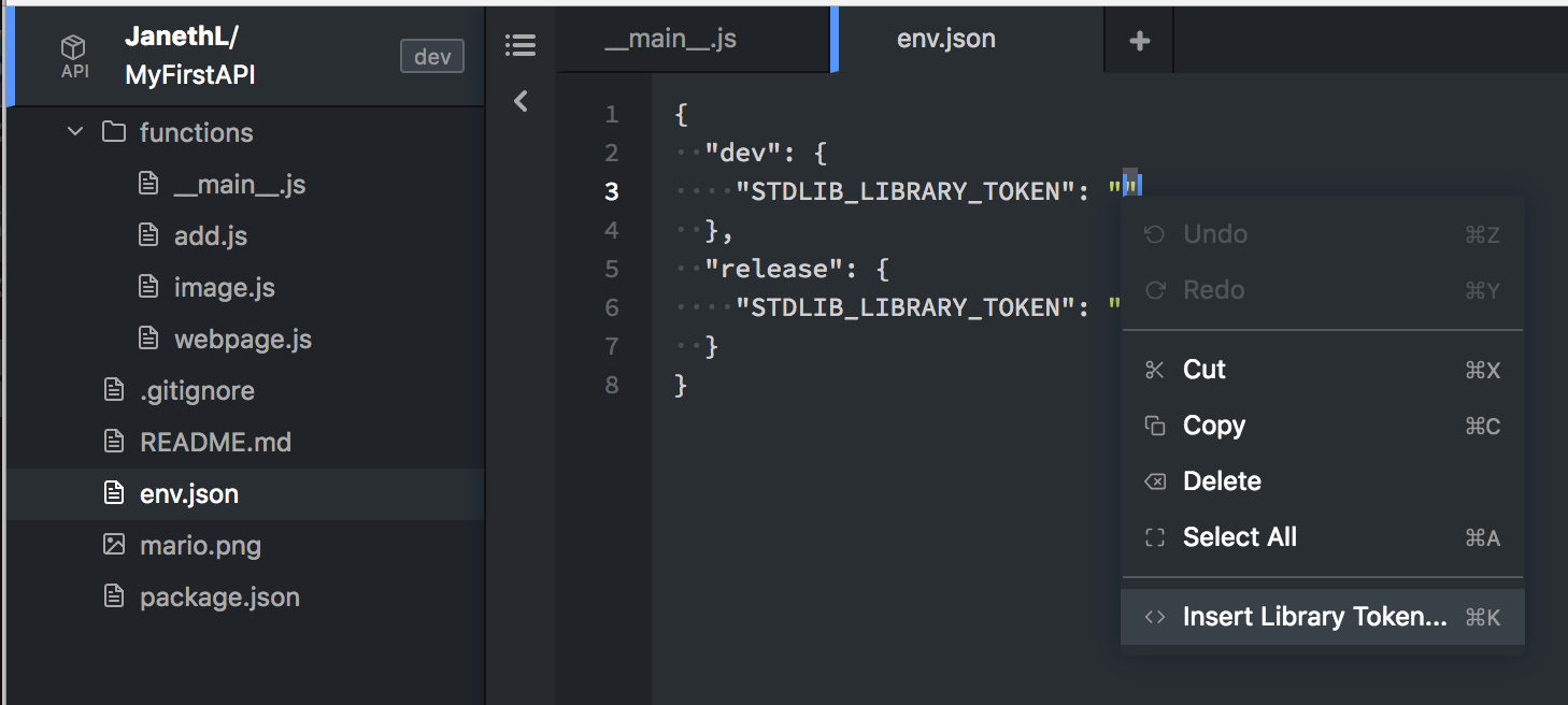 Navigate to the env.json file (click env.json in the tree view on the left), there you will see "dev" and "release" environment’s waiting for you to input your "STDLIB_LIBRARY_TOKEN".