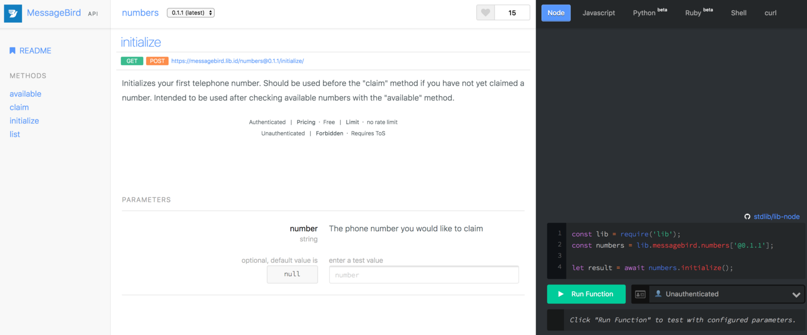After you’ve done that, you can claim your first number directly from the browser! Scroll down the page to the available method on the numbers API: