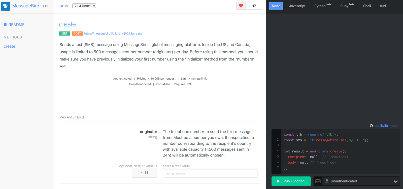 The “create” method in the messagebird.sms API