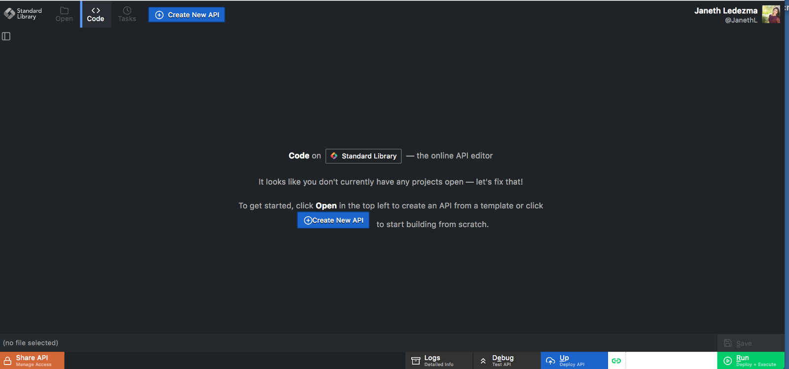 The first step is to head over to Code on Standard Library. Code on Standard Library is an online API editor built by the team at Standard Library — an embeddable development environment for easily building APIs, webhooks, and workflow automation tasks.