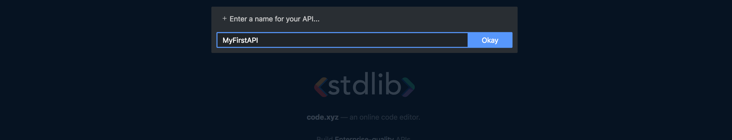 - Enter a name for your API. For the purposes of this tutorial, I suggest you name it MyFirstAPI and hit Okay (or press enter).