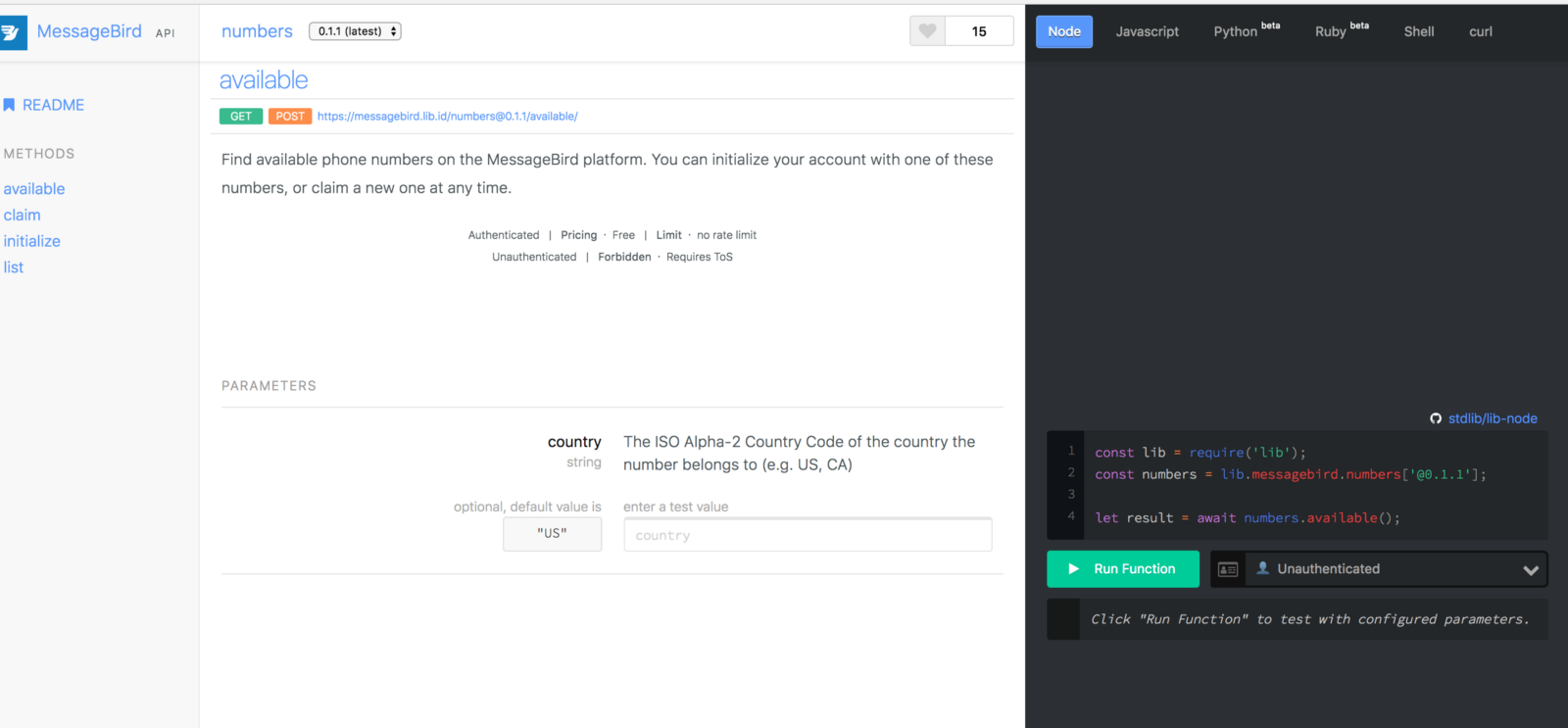 Currently, only Canadian and US numbers are available — choose the appropriate country code based on your location (if you’d like to see a specific region or country added, e-mail us!) Select one of your Standard Library tokens from the dropdown to the right (it should say Unauthenticated) and press the Run Function button to see a list of available numbers.