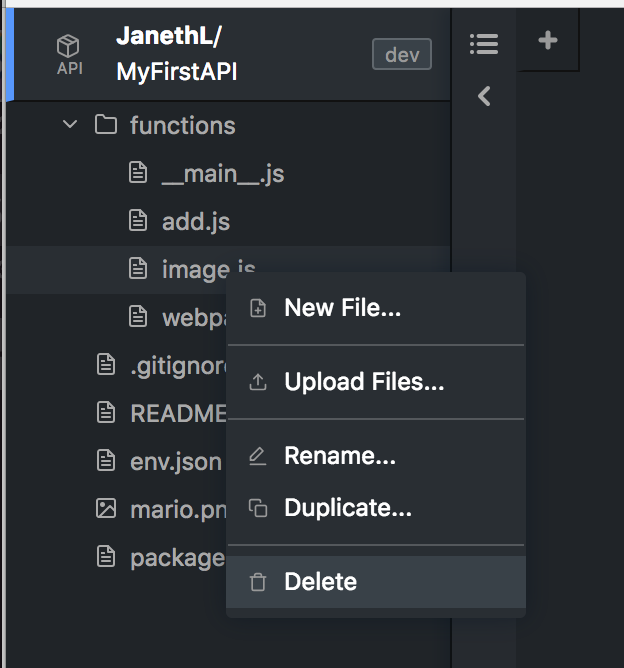 The default sample API package (blank) may have some extra endpoints and files that you don’t need (like anything in the functions/ folder aside from your __main__.js endpoint)— you’ll want to clean these up eventually. To remove (and otherwise manage) files, right click on the file or folder you’d like to remove and click Delete.