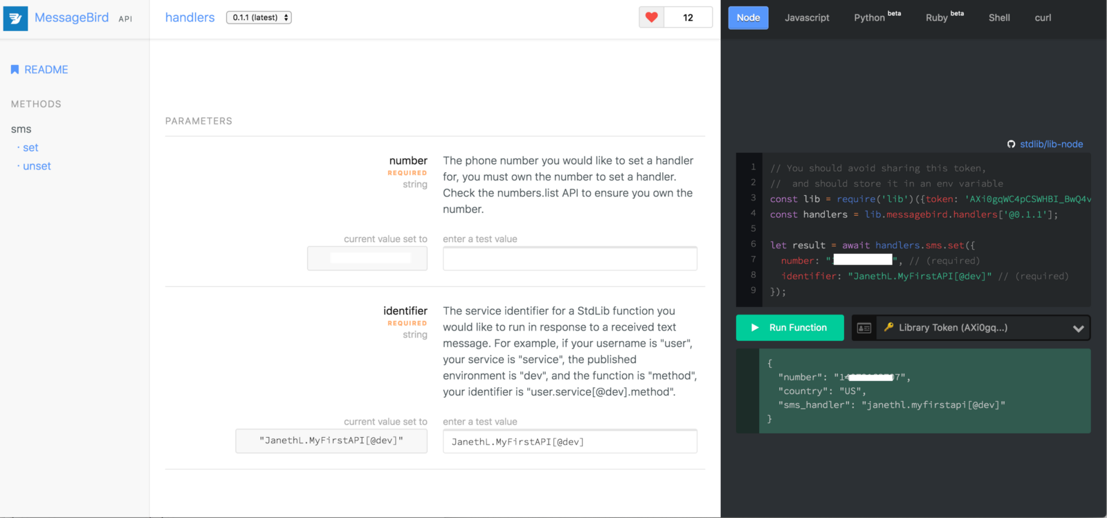 When you set your service as a handler for the number you just claimed with MessageBird handlers API, it will trigger whenever that number receives a text message. We will use the[messagebird.handlers.sms.set](https://stdlib.com/@messagebird/lib/handlers/#sms-set) API method. You can do this directly from the browser! Head on over to https://stdlib.com/@messagebird/lib/handlers/.