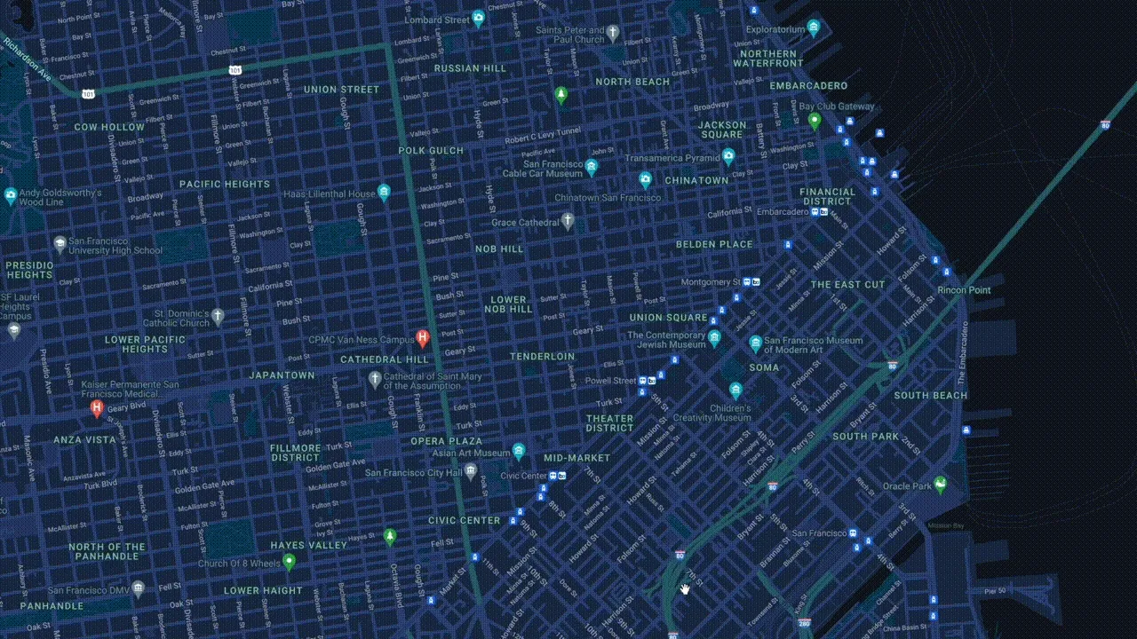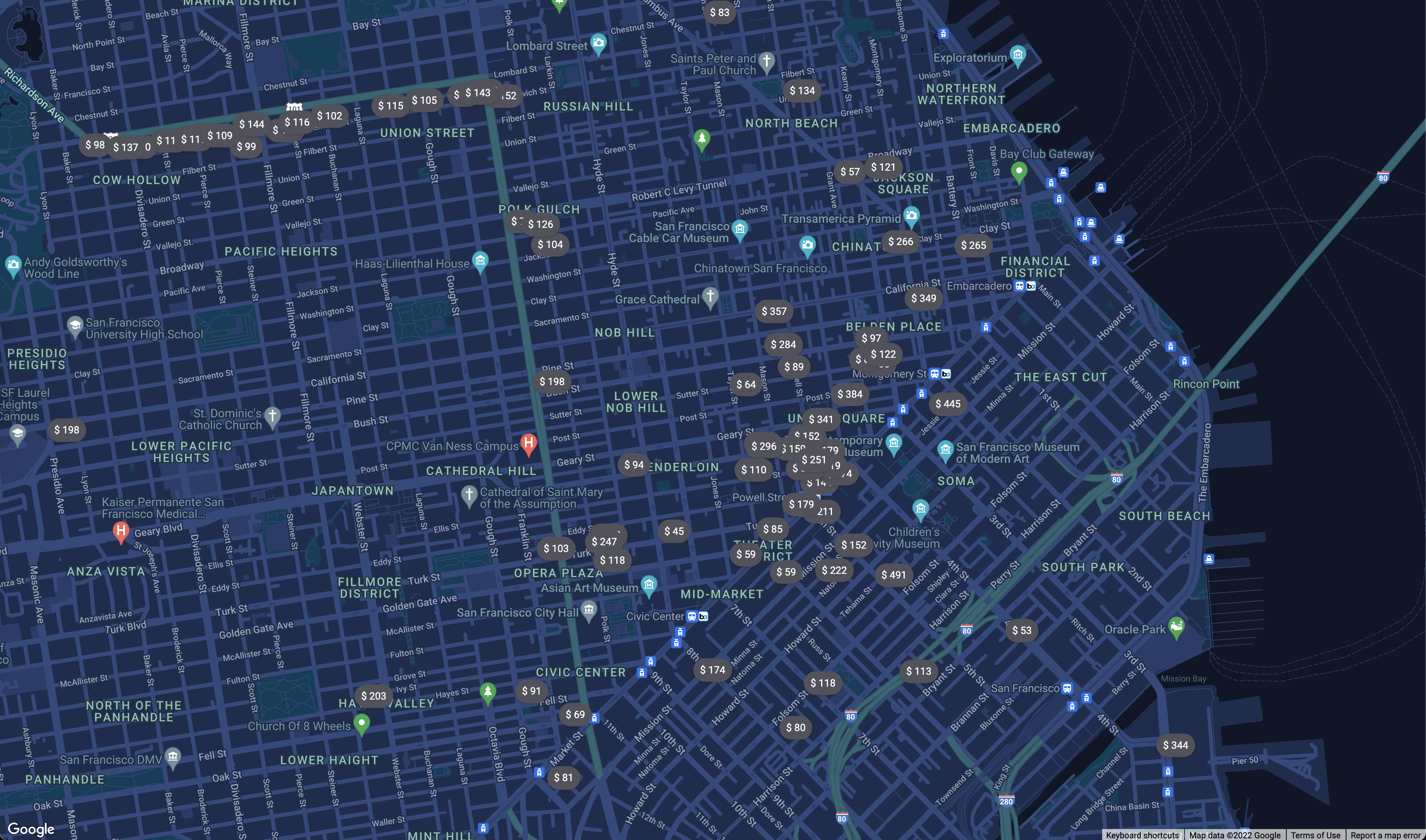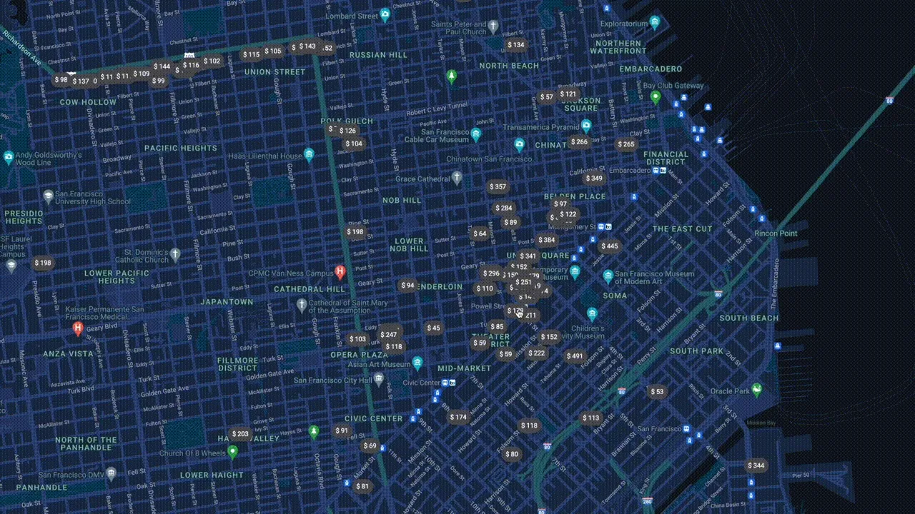 These markers pack much more functionalities than the default markers from Google Maps. Besides custom styling, each marker displays dynamic pricing and states. When you interact with them, you'll see custom React components rendered with data.