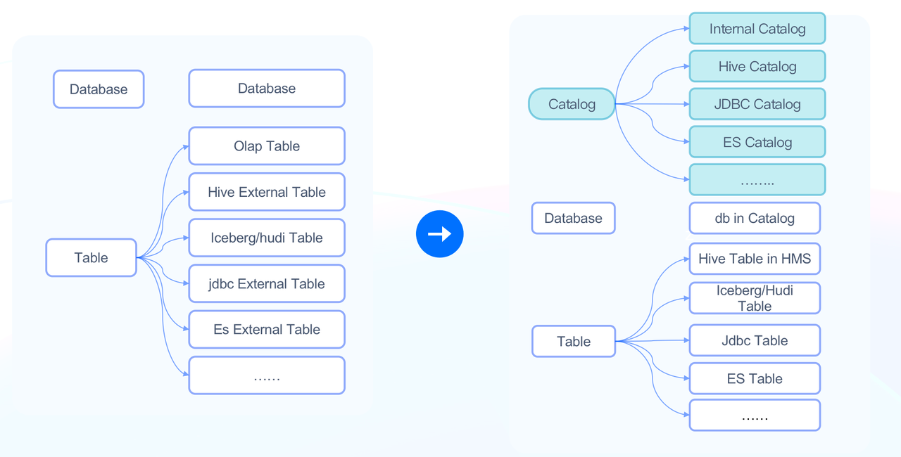 Older versions of Doris support a two-tiered metadata structure: database and table. Users need to create mappings for external databases and tables one by one, which is heavy work. Thus, Apache Doris 1.2.0 introduced the Multi-Catalog functionality. With this, you can map to external data at the catalog level, which means:
