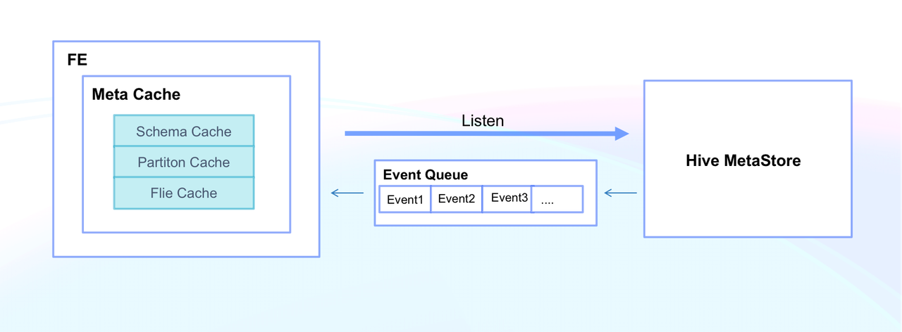 Doris enables high efficiency in metadata access by Meta Cache, which includes Schema Cache, Partition Cache, and File Cache. By this means, Doris can respond to metadata queries on thousands of tables in milliseconds. Doris supports manual refresh of metadata at the Catalog/Database/Table level. Meanwhile, it enables auto synchronization of metadata in Hive Metastore by monitoring Hive Metastore Event so any changes can be updated within seconds.