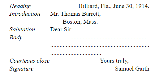 Before we look at some actual letters to judge of their effectiveness, we must learn the conventional form of a letter, the parts which many years of use have shown to be necessary.