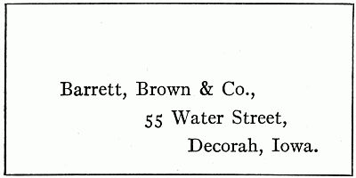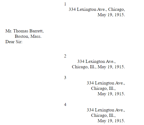 Note.—The punctuation as shown in the examples given above is that in more prevalent use. Certain writers, however, advocate the omission from the formal parts of the letter of commas at the end of lines and of periods (except to show abbreviations).