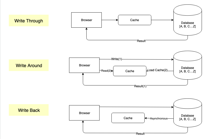 Write caches, as the name suggests, enables fast writes. Imagine a write-heavy system, and we all know that writing to a DB is costly. Caches come in handy and handle the DB write load, which is later updated to the DB in batches. It is important to notice that the data between the DB and the cache should always be synchronized. There are three ways one can implement a write cache.
