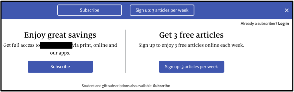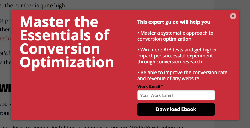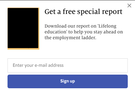 Then, just as I finish reading the first sentence, hoping to get into a good rhythm, the content is cruelly occluded with a dark transparency, on top of which appears a garish overlay that is clearly the creation of minds that believe I will subscribe to a newsletter or download an ebook without first having had the opportunity to be impressed by the content they provide: