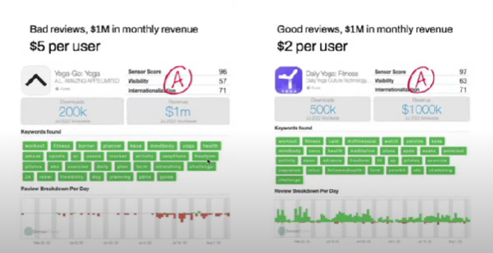 As we can see from the comparison, the apps are almost identical. Each of them received around $1m in profits in a month and performed great, but one app had bad reviews and paid $5 per user while getting 200 downloads, the other paid less — $2 per user, and had 500 downloads and great reviews. Still, their revenues are the same. It means that the first app did better in sales.