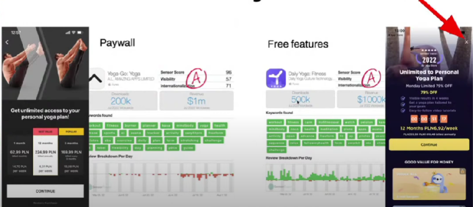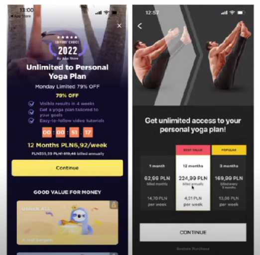 One of the criteria to validate new products is to see if the idea of the app is unique. Yes, if your app has found a new niche and there are no competitors, you won’t necessarily need such tricks to get users to subscribe to your product. In our example, both apps are coming from a highly competitive industry, and both apps give access to yoga lessons. And there are thousands of such apps on the market, but still, these apps are highly successful.