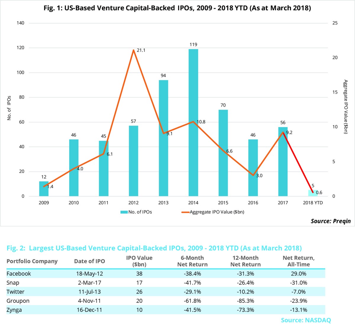 The IPO market has historically been cyclical, moving in pace with the public equity markets. This was demonstrated following the Global Financial Crisis, when US IPO activity dropped off sharply, only to slowly rebuild itself and hit a post dot-com boom with 119 US venture capital-backed companies holding an IPO in 2014. However, despite strong performance for the S&P 500 Index since then, IPO activity has tapered off over the past three years, as seen in Fig. 1. This is a trend among current unicorns, which have chosen to remain private for longer periods as they wait for the perfect market conditions to file for IPO. Since 2009, the only venture capital-backed US-based companies to file for IPO with a valuation over $7bn are Facebook, Snap, Twitter, Groupon and Zynga. Looking at each of their post-IPO performance (Fig. 2) shows why other large unicorns may be hesitant to open themselves up to public markets, as only Facebook has experienced positive all-time performance.