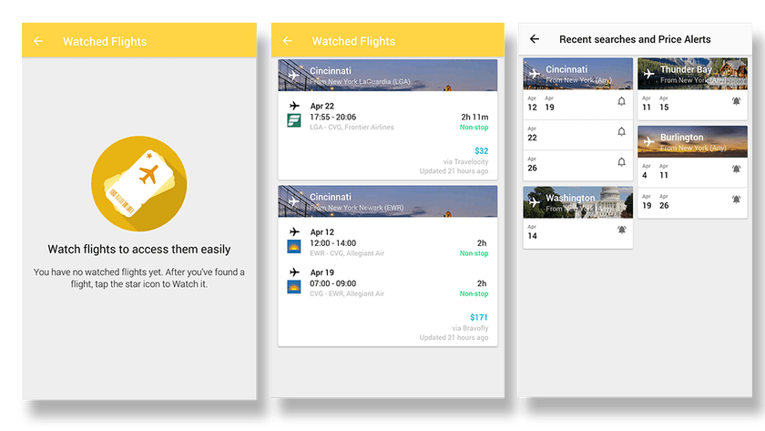 SkyScanner, a travel fare aggregator app, is based on the same concept. Users can use it to add and monitor flights with price alerts. By adding a price alert, or choosing to monitor a flight, user will definitely come back to the app in the near future.
