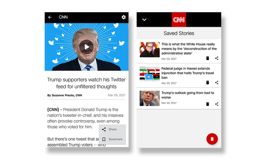 For example, allowing users of a news feed app (like the CNN app you can see below) to bookmark or favorite an article to read on later during a future visit, provides the illusion of commitment; an illusion that will bring the user back to the app.
