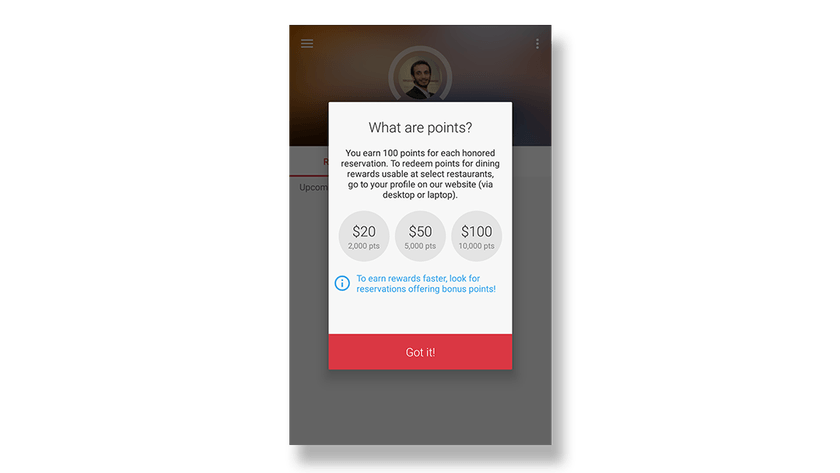 Introducing loyalty schemes in apps can arouse the same feeling. For example, OpenTable, a popular reservation app, introduced a dining rewards program where users can receive points for honouring the reservations they made and redeem them at a later day. Killing two birds with one stone: active participants that leave feedback that helps others AND repeat dinners.