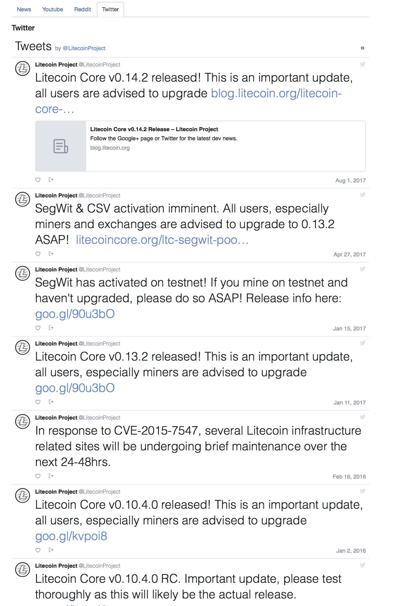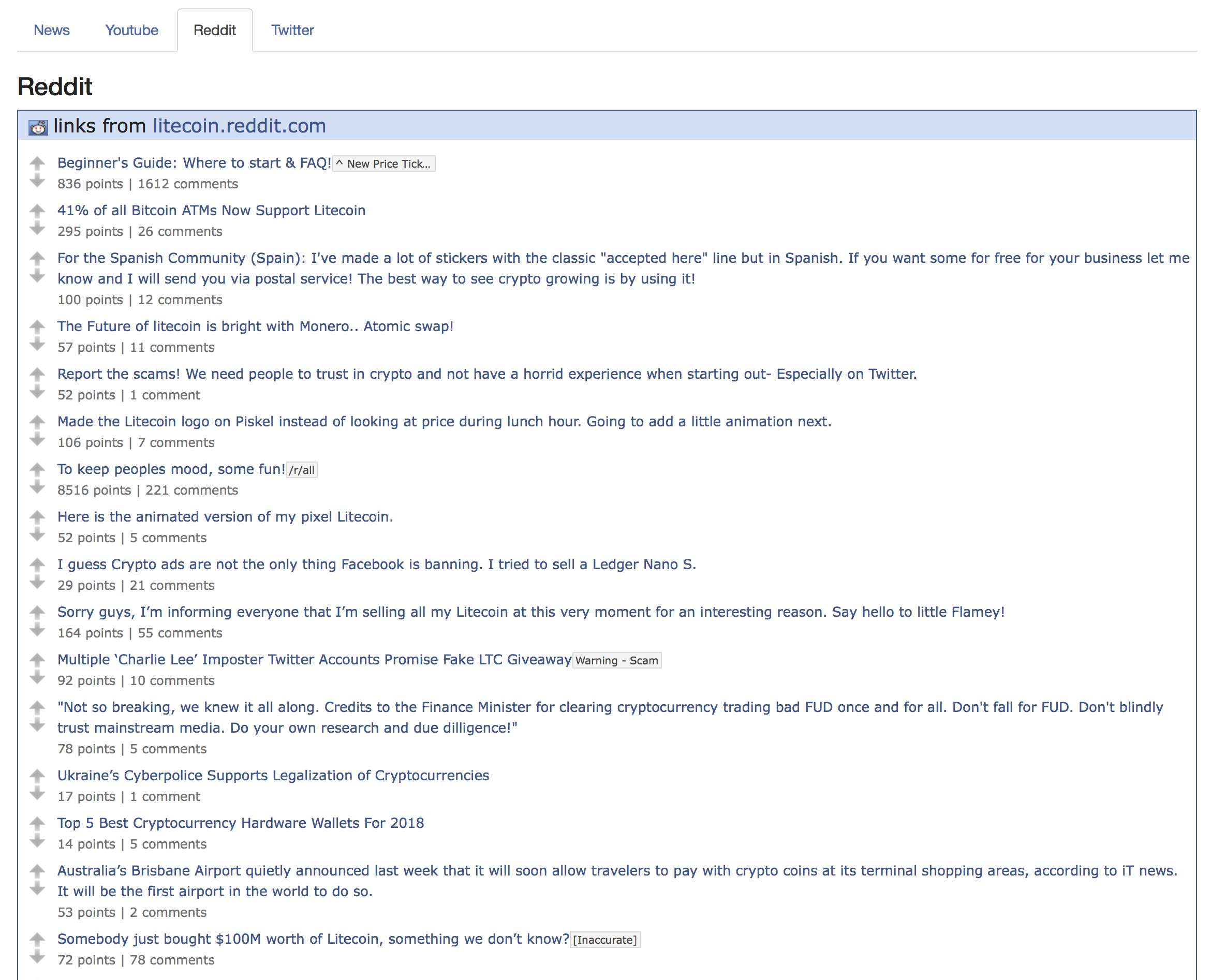 - Reddit posts for the coin’s subreddit page. This gives you the sense of the community — what they are talking about, what they are worried about, and what they are excited about.