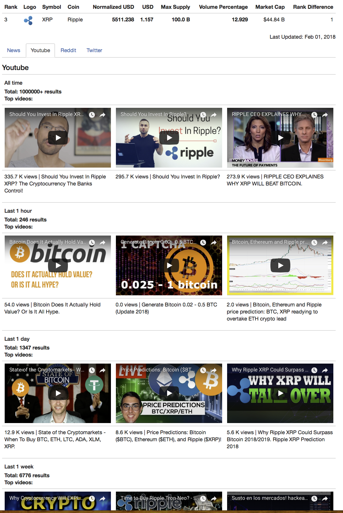 - Top YouTube videos (based on view count) for a given coin in the last hour, last day, last week and last month.