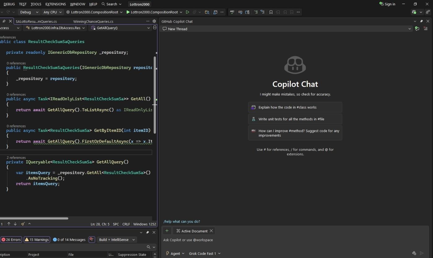 Each model received identical instructions through Copilot Agent Mode in Visual Studio 2026. The task was straightforward but realistic: refactor data access logic in 6 repository classes where the implementation was wrong. Each class had the same three methods that needed updating.