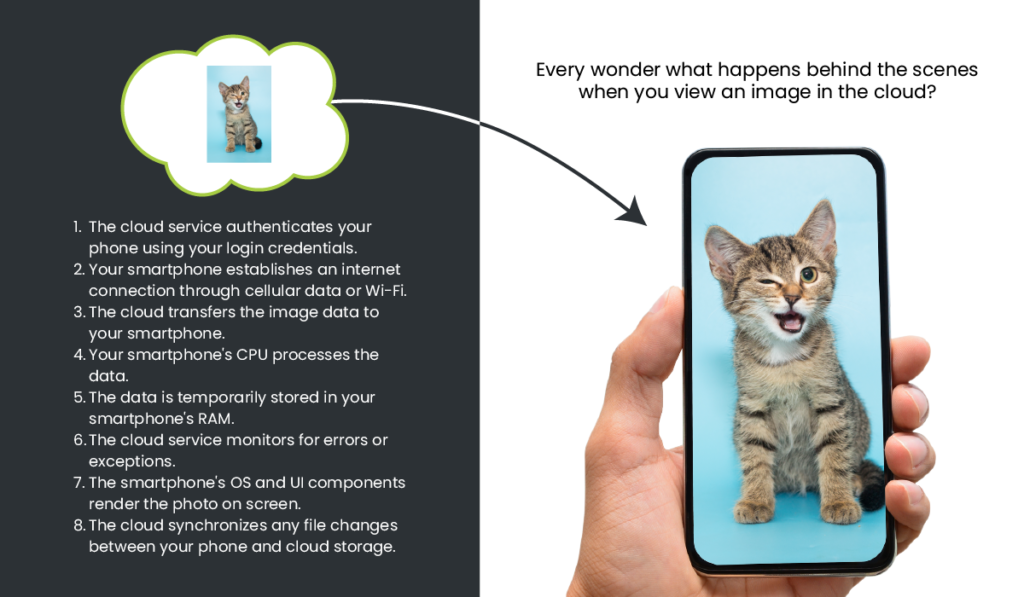 As was stated previously, many devices like smartphones share the computational workload with the cloud. To illustrate this, let’s look at a few of the steps in the “simple” process of using your phone to view an image saved in the cloud: