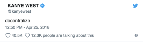 In one of his infamous tweet storms, Kanye recently posted “decentralize,” a word that may best define the philosophy behind cryptocurrencies. Maybe KanyeCoin is next?