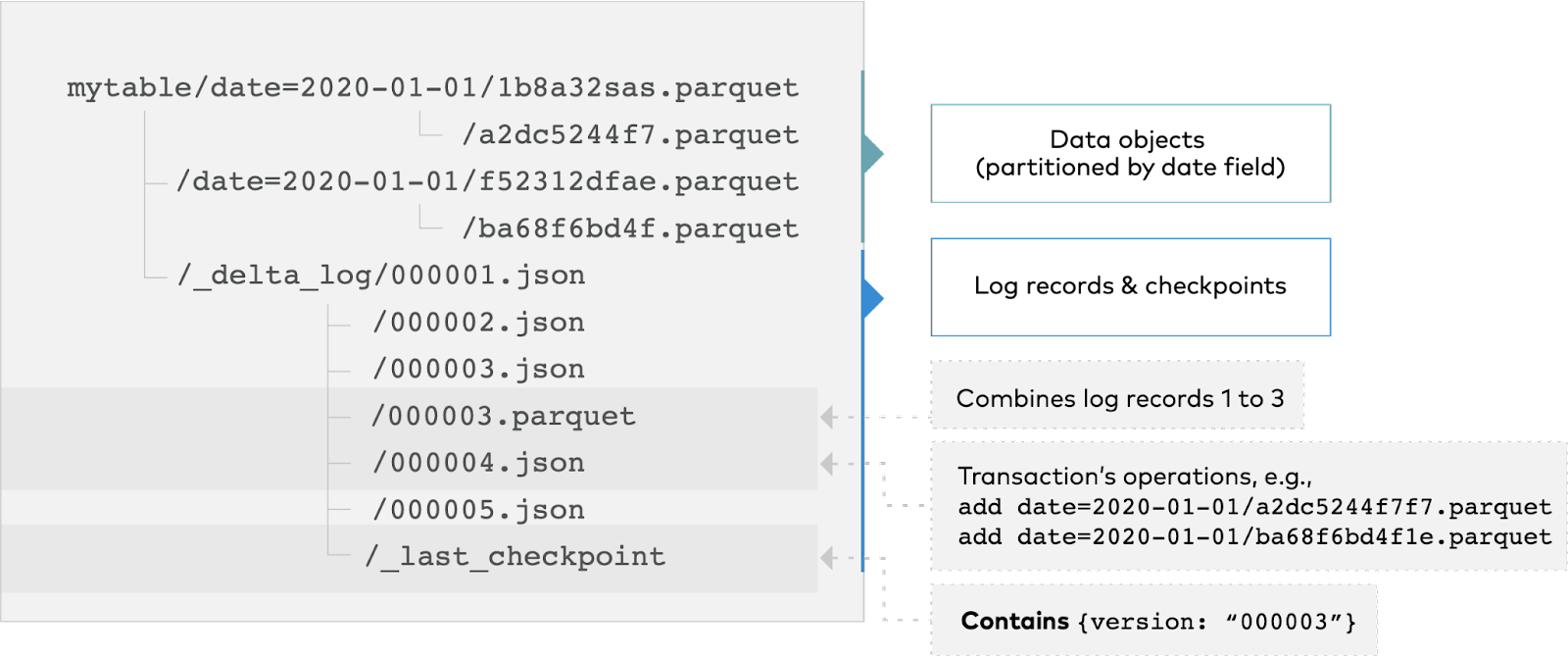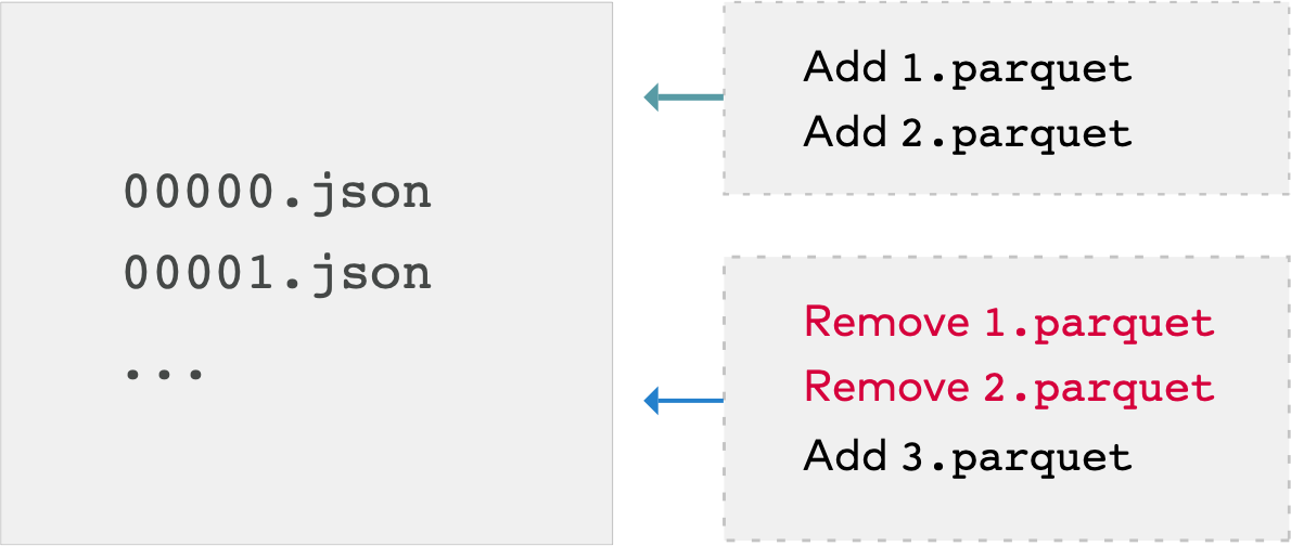 Let’s say we add new records to our table from the data files 1.parquet and 2.parquet. That transaction is added to the DeltaLog and saved as the file 000000.json. Later, we remove those files and add a new file 3.parquet instead. Those actions are recorded as a new file, 000001.json.