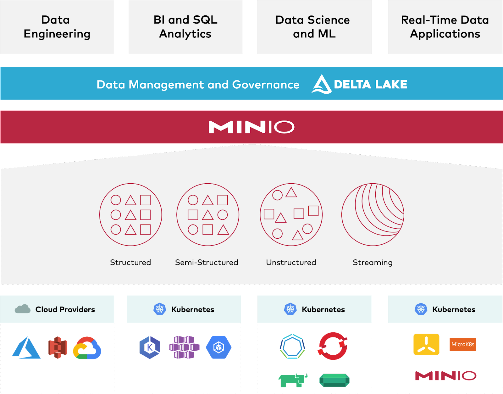 Lakehouse architecture, Delta Lake in particular, brings key new functionality to data lakes built on object storage. Delta Lake works with a large and growing list of applications and compute engines such as Spark, Starburst, Trino, Flink, and Hive, and also includes APIs for Scala, Java, Rust, Ruby and Python. Built for the cloud, Kubernetes-native MinIO enables performant, resilient and secure data lake applications everywhere - at the edge, in the data center and in the public/private cloud.