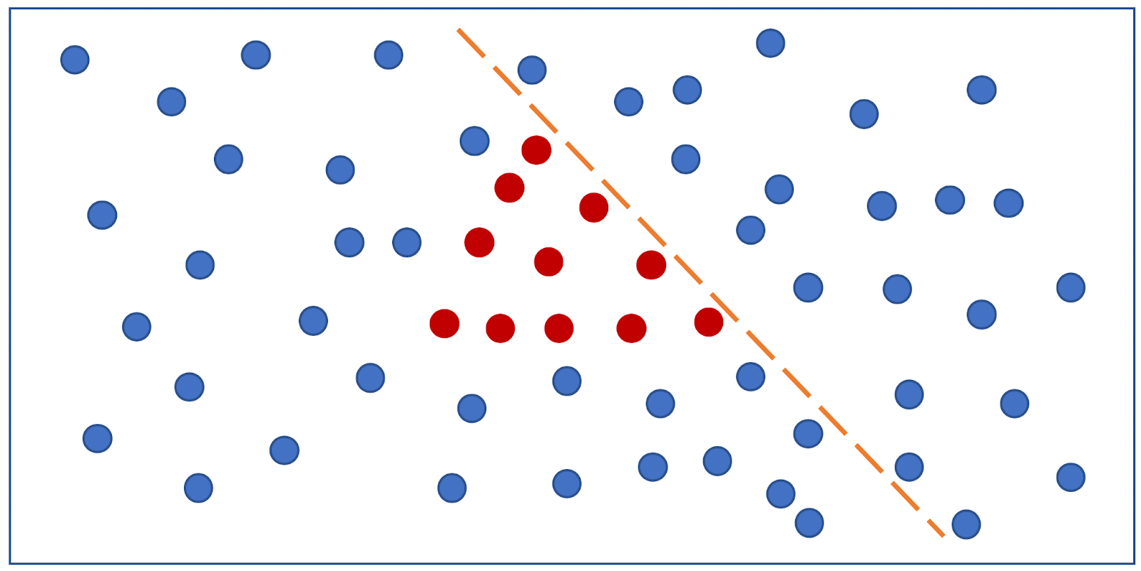 Let us imagine that we have a classification task based on two features with the elements of the training sample that are distributed like in the image below (different classes are marked by different colors).