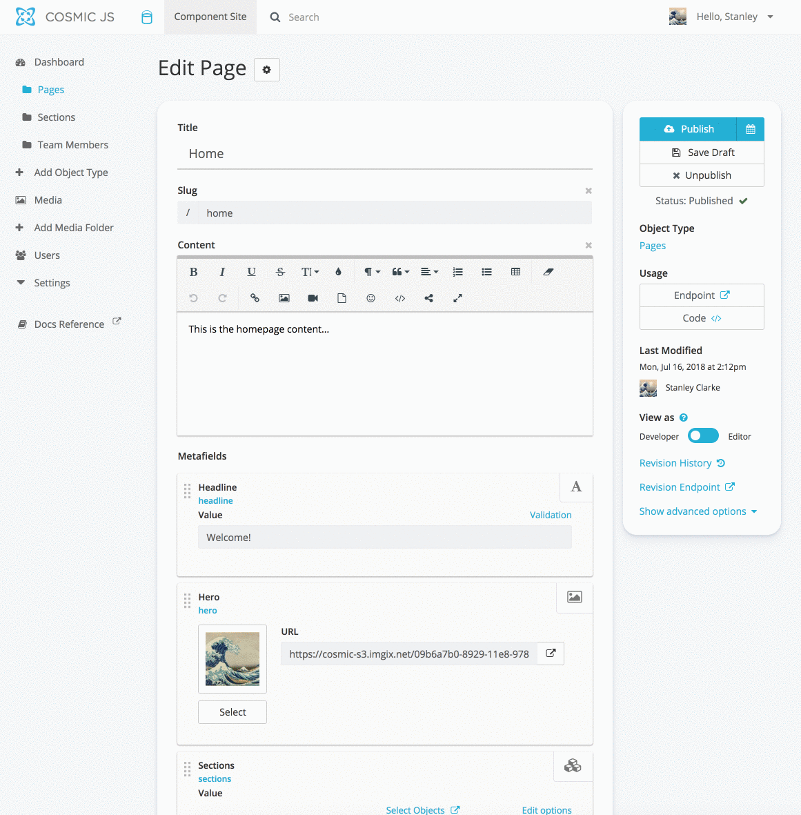 The Cosmic JS CMS is a great solution for building component-based websites. In our example, we created a Page Object with a Multiple Object Metafield connected to a Sections Object Type to add our Section components. The benefit to this approach is that we can now manage the section content in one place and reuse it across pages without having to go into each page to edit duplicate data.