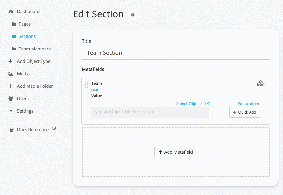 The Multiple Objects Relationship Metafield will be used to manage the Page Sections.