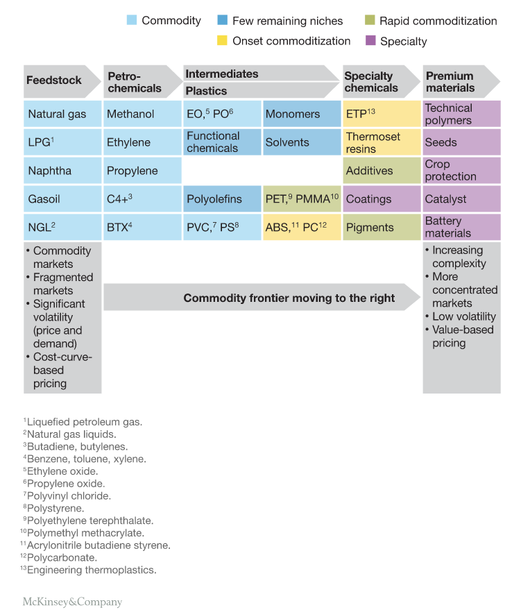 Enough listing, you get the picture. A nice visual of how the chemicals business is becoming commoditized can be visualized in this excellent figure form McKinsey and Company.