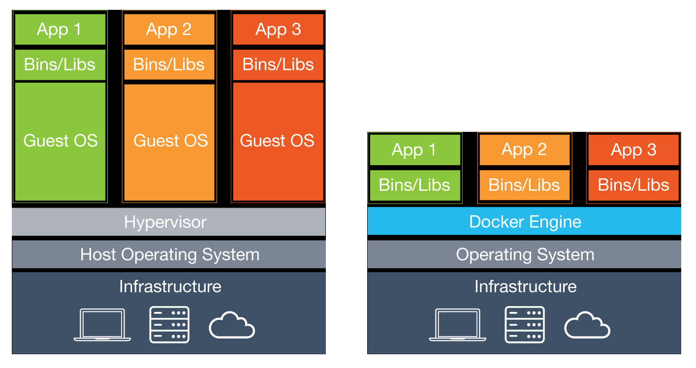 Here you can see a nice overview. Virtual machines use something called a hypervisor. It manages every virtual machine on a host. And as you can see every VM has its own operating system. While containers share the host operating system. Making containers significantly smaller and much faster to create and delete.