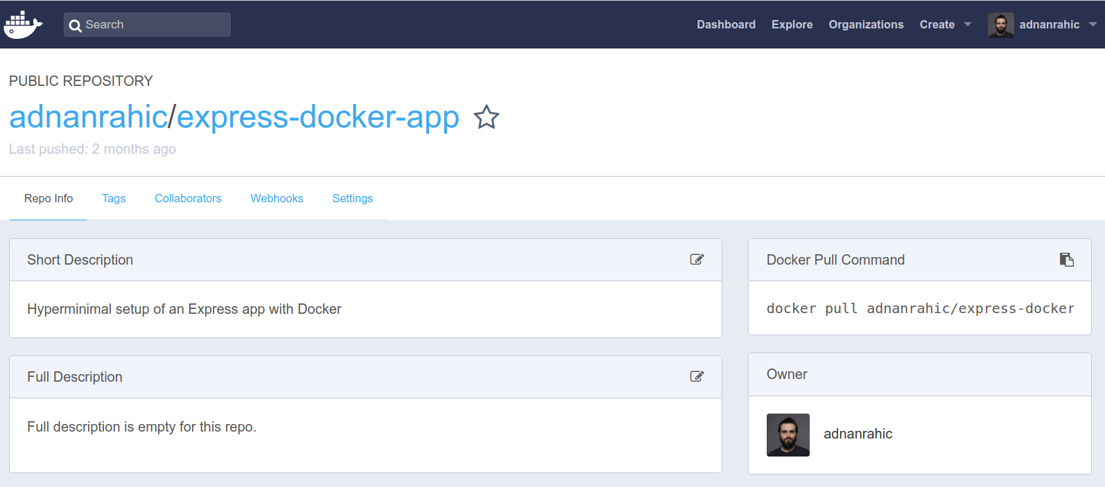 Once you push the image, your Docker Hub profile will list the image. It'll look something like this.