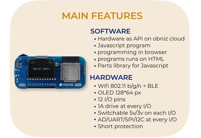 Obniz is a cloud-connected IoT development board. You can program on the web browser of any smartphone or computer and the command is sent to obniz through the internet via obniz cloud. By connecting the Obniz to the cloud through wifi, users can remotely control devices that are physically connected to obniz.