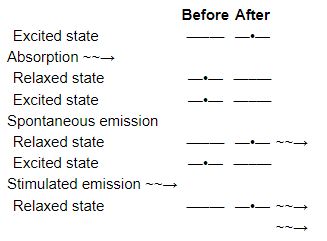 Einstein wrote that when such a photon of energy caused an electron to drop from a higher to a lower orbit, the electron would emit another photon of the same frequency and in the same direction as the one that hit it. In other words, the energy of the emitted photon would be added to that of the photon that stimulated the emission in the first place. Here, potentially, was light amplification. The three major factors, absorption of energy, spontaneous emission, and stimulated emission are diagrammed in Figure 14.