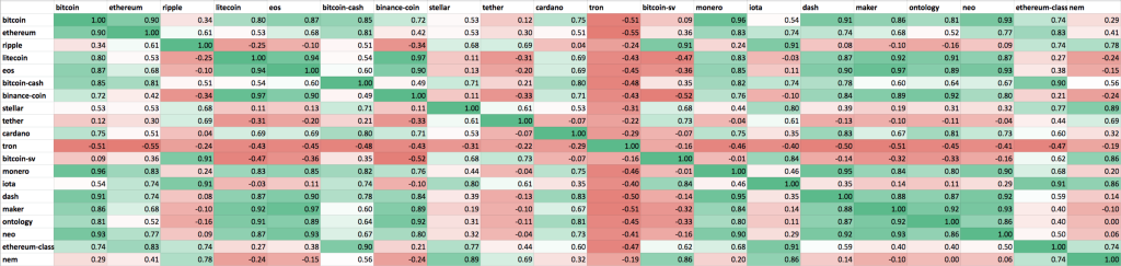 At a glance, it looks like cryptocurrencies are less correlated in 2019 than in 2018.